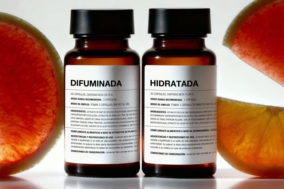 DIFUMINADA aporta fotoprotección interna gracias a los extractos de helecho (Polypodium leucotomos) y pino marítimo francés, que pueden ayudar a defender la piel frente a la radiación UV, mientras las vitaminas C, E y A neutralizan radicales libres generados por el sol. Esta protección diurna se complementa con la reparación nocturna de HIDRATADA, cuyos antioxidantes (ashwagandha y aloe vera) favorecen la recuperación del daño oxidativo acumulado, creando un ciclo continuo de protección y reparación 24/7