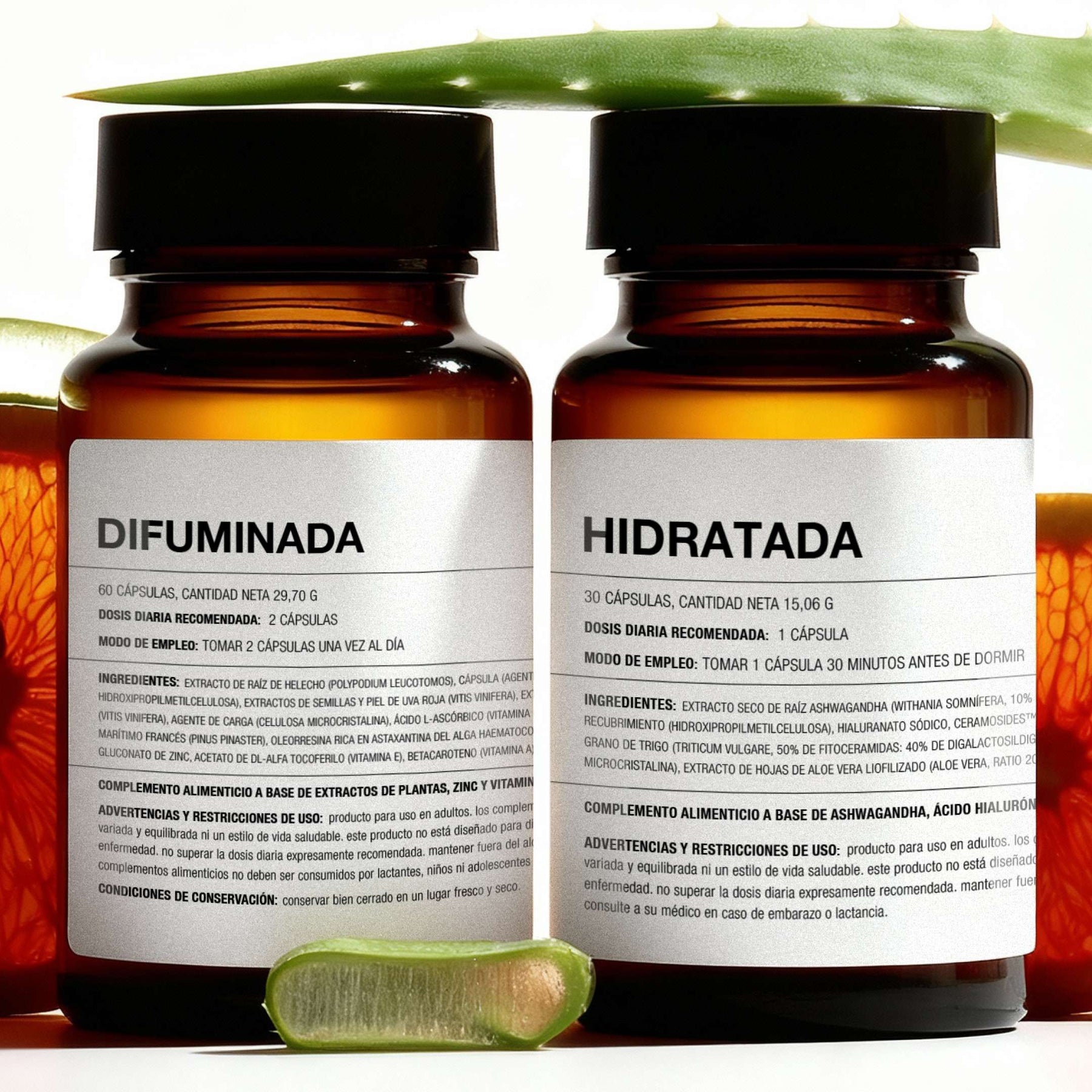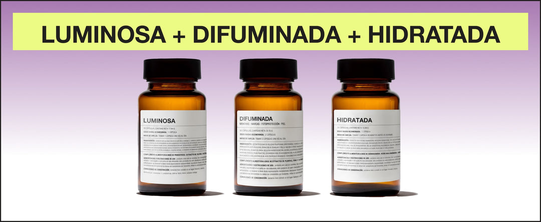 HIDRATADA impulsa la regeneración nocturna gracias a la melatonina, que ayuda a regular los ritmos circadianos y optimizar los procesos de reparación celular. El aloe vera y la ashwagandha favorecen la síntesis natural de colágeno mientras reducen el estrés oxidativo y el cortisol que pueden frenar esa regeneración. DIFUMINADA, durante el día, aporta vitamina C para la formación normal del colágeno, zinc para el mantenimiento de la piel y potentes antioxidantes (astaxantina y uva) que ayudan a proteger las fibras de colágeno y apoyar la reparación cutánea. Juntas crean un ciclo continuo de síntesis, protección y regeneración 24/7